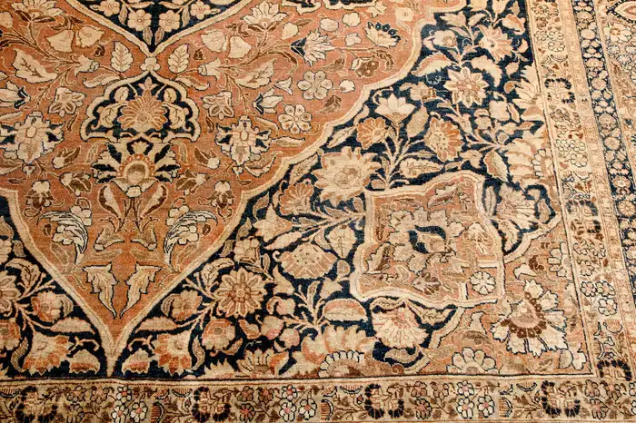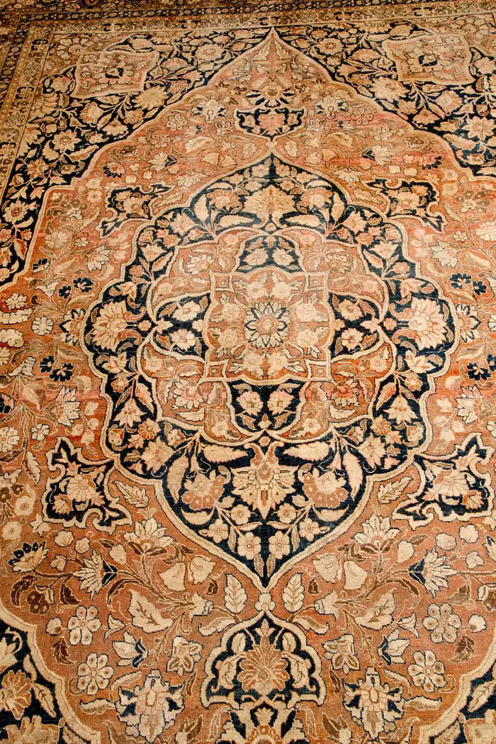 This Persian Haji Jalili carpet created, consists of cotton warp and threads, a hand-knotted wool pile and natural vegetable dyes, circa 1880. From the workshop of master weaver Haji Jalili, one of the foremost artists of his time, the style and coloration are unique to his collection. The soft red, orange and cream tones of this carpet are balanced beautifully by its deep navy, making this an exquisite piece that is both striking and calming to the eye. Its central medallion, consisting of a flower expanding outward, represents the infinity of existence. It is an exceptional and one-of-a-kind piece in excellent antique condition. The size is 9’8″ x 14’2″.